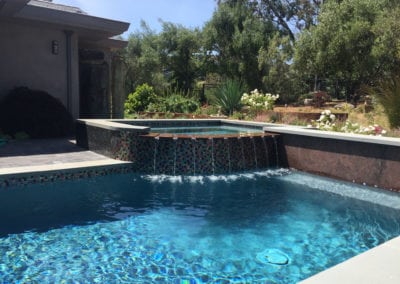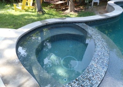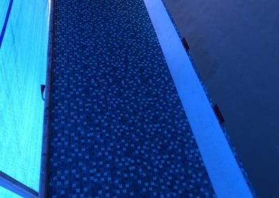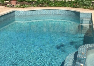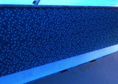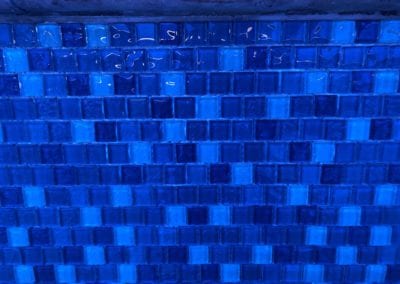 Completed pool using WetEdge Signature Matrix Brilliant Blue. One of the most popular finishes. NPT tile in Cloud Olive Blue.
