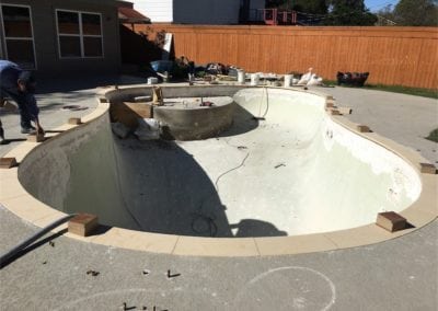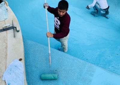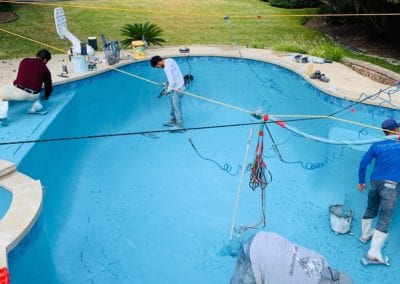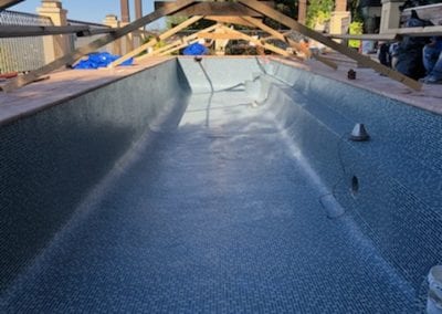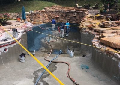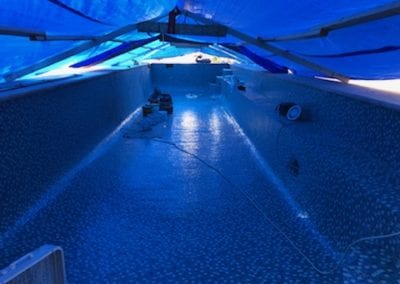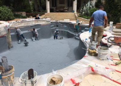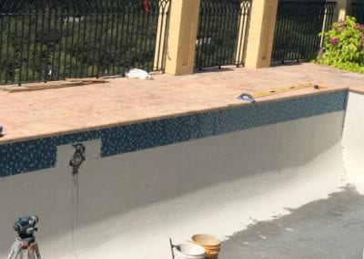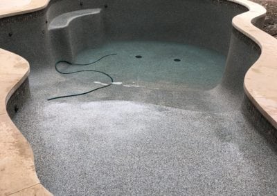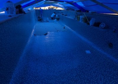 Pool during plaster using stunning WetEdge Signature Matrix Brilliant Blue. NPT tile in Blue Seas Light Blue with Buff lueder coping.