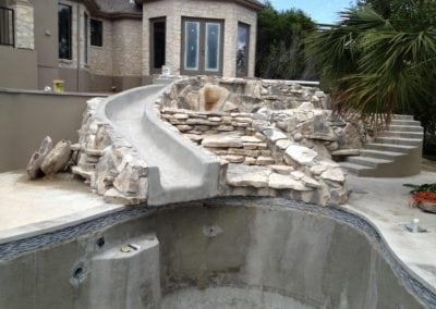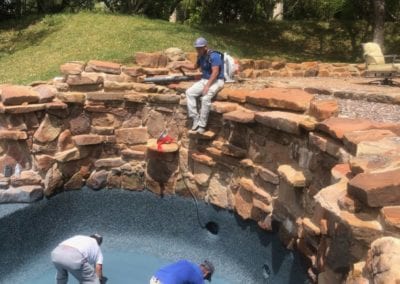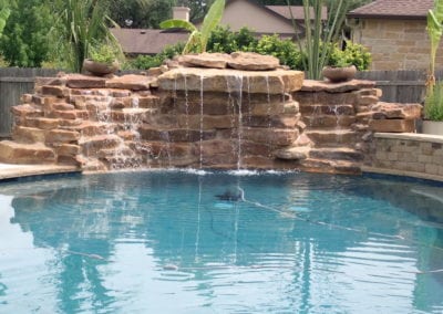 Waterfall built and plumbed by Clear Solutions. Materials include Texas Moss Rock, sealed, waterproofed and channeled with natural stone, powered by dedicated VS Pump.