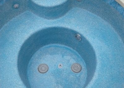 Newly completed spa post acid wash using stunning WetEdge Signature Matrix Brilliant Blue. NPT tile in Blue Seas Light Blue with Buff lueder coping.
