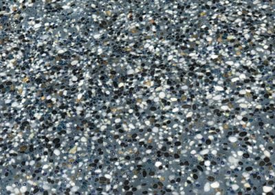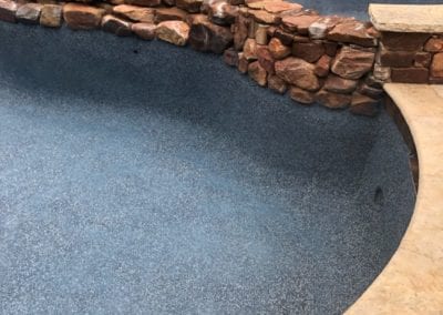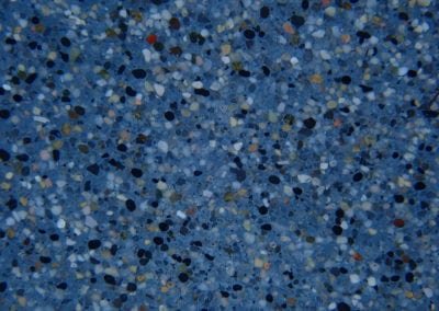 NPT Stonescapes Tropics Blue Mini pebble plaster with extra Abalone Shell. NPT Aztec Cobalt tile was used. Coping on pool and raised beams and planters is double chipped Faced brown lueder, sealed and sanded. Decking in Classic Texture Cool deck with non slip additive added, color is Limestone.